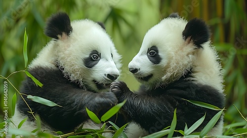 © AdibaZR, Naklejka premium Two adorable panda cubs face each other amidst lush green bamboo.