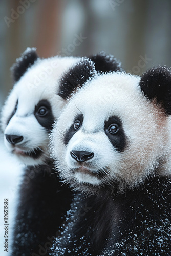 © Johanddss, Fototapeta premium Two Adorable Panda Cubs Playing in Winter Snow