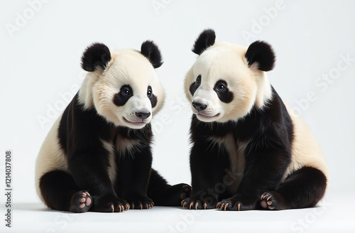Naklejka premium Two adorable panda cubs sitting together on white background.