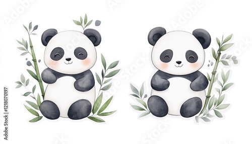 Obraz premium Two adorable panda illustrations surrounded by bamboo, showcasing their...