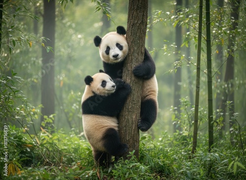 © khanifah, Naklejka premium Two adorable pandas climb a tree in a lush bamboo forest, gazing at the camera