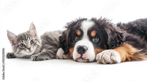 © PaulShlykov, Obraz premium Two adorable pets relax together on a white background, showcasing the bond between a puppy and a kitten in a cozy moment