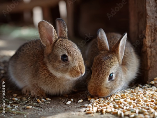 © VexoraImages, Fototapeta premium Two adorable rabbits eating wheat grains in a barn