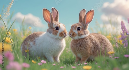 © Ta Sher, Fototapeta premium Two adorable rabbits meeting in a blooming meadow.