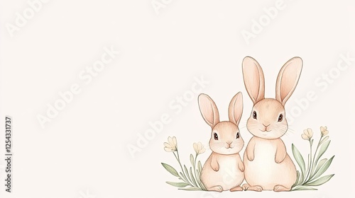 Fototapeta premium Two adorable rabbits standing together among delicate flowers on a soft...