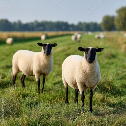 © zacty6, Naklejka premium Two Adorable Sheep Standing on Green Grass in a Natural Pastoral Landscape with Soft Light and a Peaceful Atmosphere Perfect for Farm-Themed Imagery