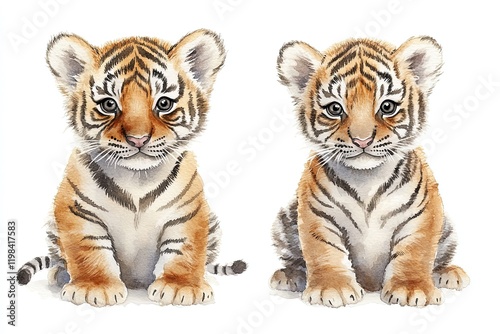 © kombet, Obraz premium Two adorable tiger cubs sitting side by side, showcasing their playful nature.