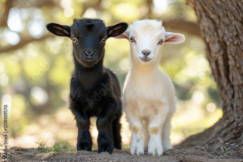 © artdolgov, Fototapeta premium Two adorable tiny goats, one black and one white, stand side by side beneath the shade of trees in a sunny pasture, enjoying a beautiful day outdoors.