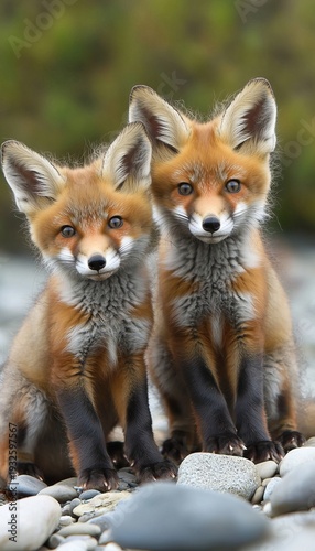 Naklejka premium Two Adorable Young Red Foxes Sitting on a Pebble Beach, Playfully Posing for...