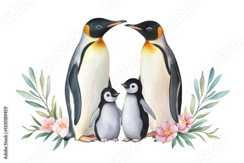 Fototapeta premium Two adult penguins with two chicks surrounded by flowers and leaves