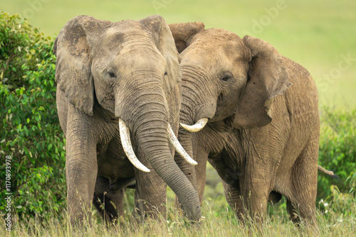Obraz premium Two African elephants standing by bushes together