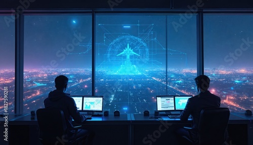 © Vadym, Obraz premium Two air traffic controllers manage flights from command center overlooking glowing city at night. Dispatchers use computers to monitor holographic airplane on virtual runway. Advanced aerospace