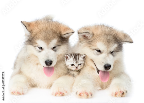 Obraz premium Two Alaskan malamute puppies lying with tiny kitten. isolated on