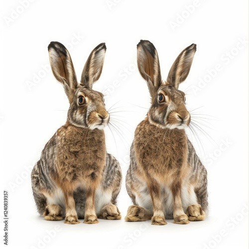 © nsit0108, Obraz premium Two alert european hares sitting side by side against a clean white background