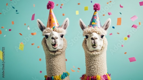 © Thanthara, Fototapeta premium Two alpacas in crazy party outfits with party hats on colorful background, advertising, creative party animal concept, copy space, birthday party invitation card