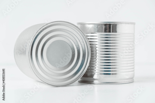 © Andriy, Obraz premium Two aluminum closed metal cans on a white table. Copy, empty space for text