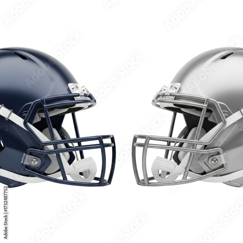 © Mike, Fototapeta premium Two American football helmets, matte dark blue and metallic silver, facing each other on a transparent studio background with copy space, symbolizing sports rivalry and competition