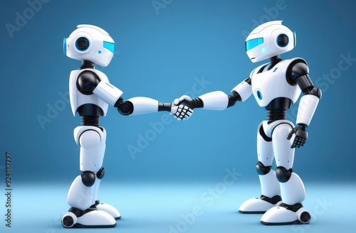Fototapeta premium two android robots made of metal shaking hands on blue background. AI...