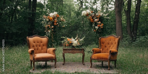 Obraz premium Two Antique Armchairs Flanked by Floral Arcs in a Wooded Setting