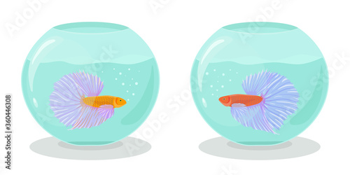 © Anna, Naklejka premium Two aquariums with fighting siamese fishes in flat style. Vector hand drawn illustration of betta or cockerel fishes swimming in an aquarium.