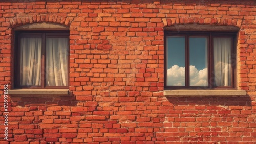 © Sahira Design, Fototapeta premium Two arched windows with curtains and cloud reflections in a weathered brick wall