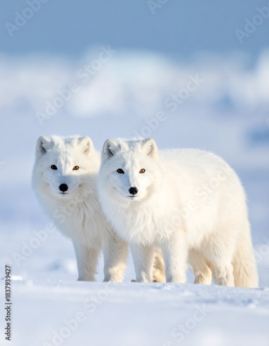 © Kati Lenart, Obraz premium Two arctic foxes closeup on frozen snowy winter background.