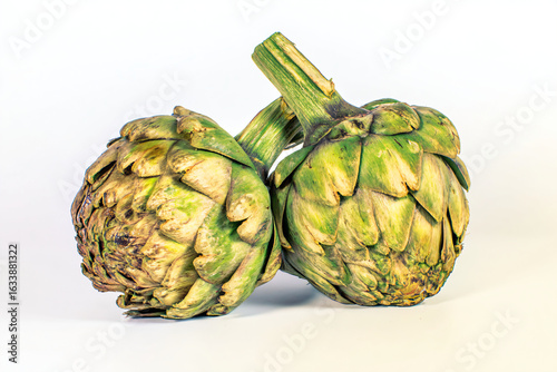 © Nam, Fototapeta premium two artichokes are sitting on a white surface