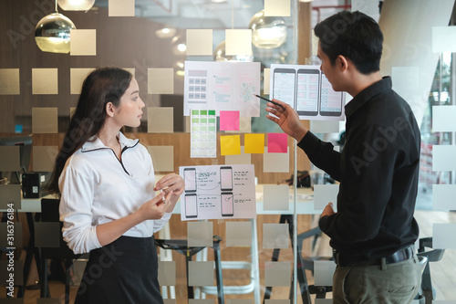 Obraz premium Two Asian application designers work together to brainstorm, outline, and...