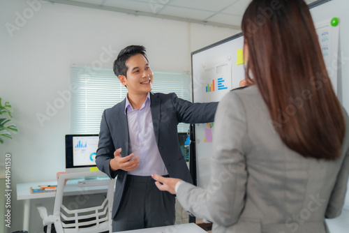 © Tj, Fototapeta premium Two asian businesspeople are discussing and presenting new project using whiteboard with sticky notes and charts in the office, teamwork concept