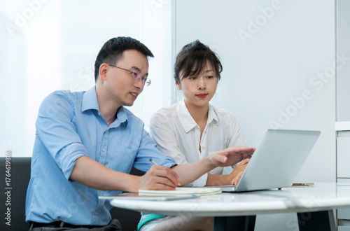 © xy, Obraz premium Two asian businesspeople working together in the office while using laptop