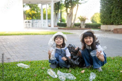 Obraz premium Two Asian Little girl is separate trash to recycle