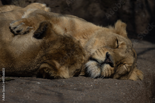 Naklejka premium Two Asiatic lions sleep and cuddle with each other on a rock. They are mostly...