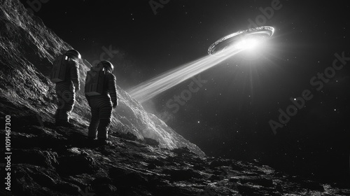 Fototapeta premium Two astronauts are standing on a rocky surface looking up at a large