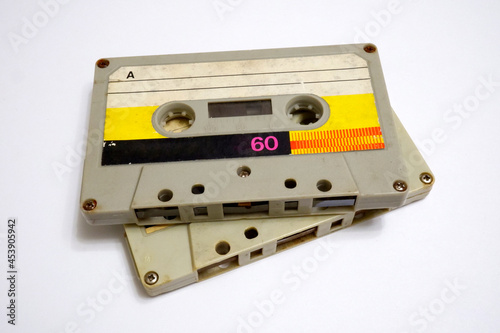 Obraz premium Two audio cassettes on a white background. Old compact cassettes