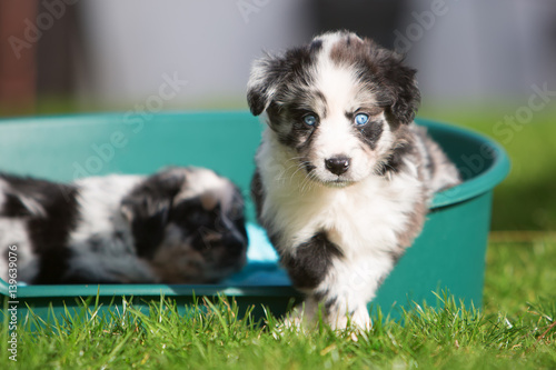 © Christian Müller, Obraz premium two Australian Shepherd puppies in a dog basket