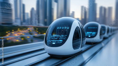 © B8stock, Obraz premium Two autonomous trains traveling on a track in a minimalist realistic setting showcasing modern transportation