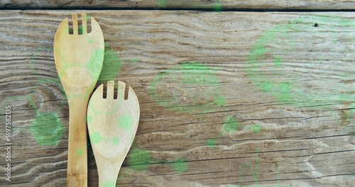 © vectorfusionart, Fototapeta premium Two bamboo slotted spoons resting left side on kitchen table with green paint stains, copy space