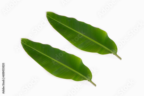 © Lee hwa bin, Fototapeta premium two banana leaves isolated on white background, supine position