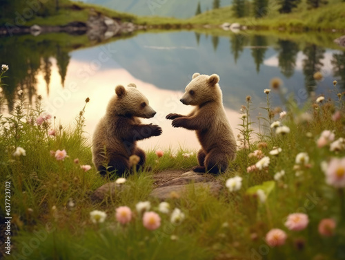 © Artemiy, Fototapeta premium Two bear cubs play together in a meadow with flowers and a lake