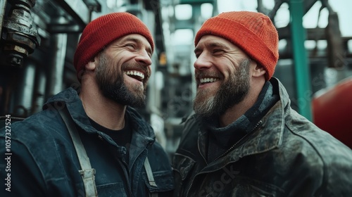 Fototapeta premium Two bearded men wearing bright red beanies share a hearty laugh at an industrial workplace, evoking camaraderie and joy, emphasizing teamwork and friendship.
