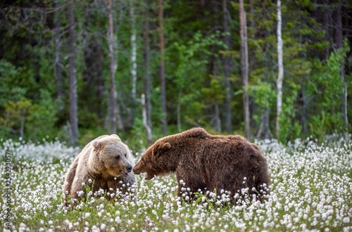 Fototapeta premium Two bears fighting in summer forest, among white flowers. Scientific name:...
