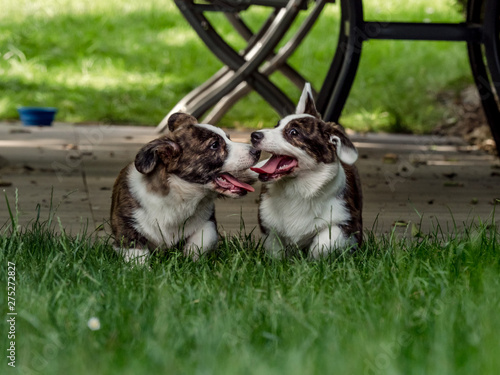 © 31etc, Obraz premium Two beautiful brown young corgi dogs playing in the green grass