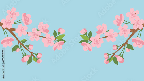 © REZA, Fototapeta premium Two beautiful cherry blossom branches with pink flowers and green leaves on a light blue background, symbolizing spring.
