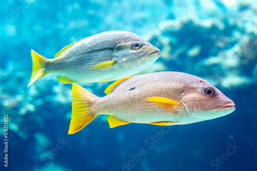 © Анна Демидова, Naklejka premium Two beautiful fish, blue and pink, in the blue water of an oceanarium. Close-up.