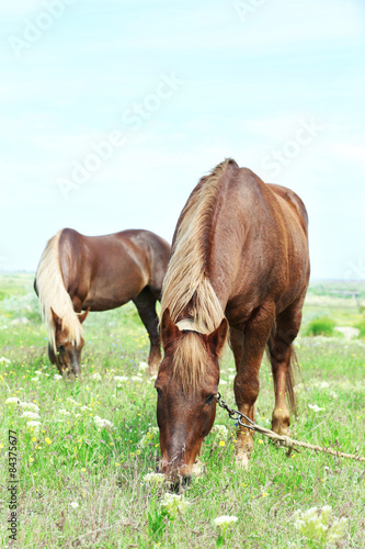 Obraz premium Two beautiful horses grazing on meadow