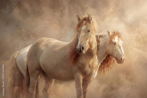 © Julia Shepeleva, Obraz premium Two beautiful horses with flowing manes are standing closely together.