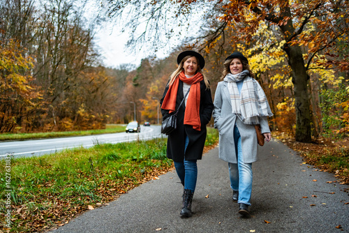 © Jacek Chabraszewski, Fototapeta premium Two beautiful middle-aged women on autumn walk. Front view