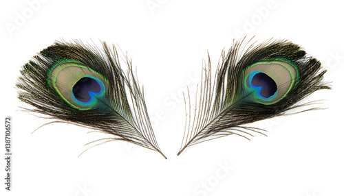 © Oleksiy, Obraz premium Two beautiful peacock feathers isolated on white