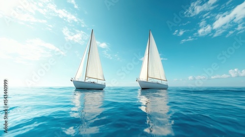 © Larisa AI, Fototapeta premium Two beautiful sailboats glide effortlessly on a tranquil blue sea, under the clear sky, symbolizing freedom and the beauty of sailing across open waters.