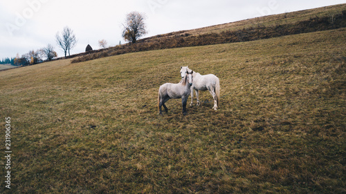 © Christina Moroz, Obraz premium Two beautiful white horses graze on the green grass meadow on the mountain hill. Gloomy autumn day
